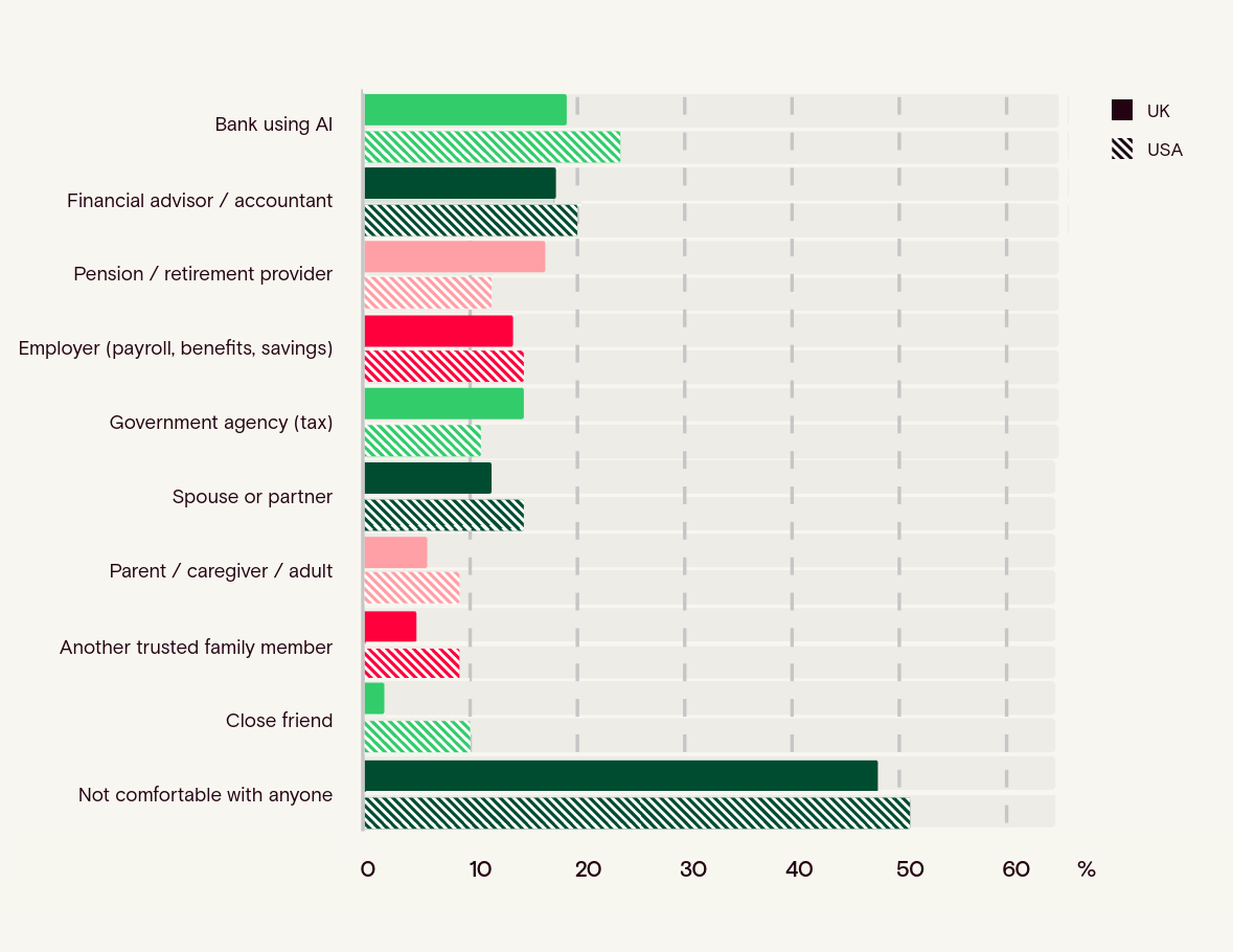Across both countries, comfort with delegating money management to AI is low, and outright rejection is the dominant response. Nearly half of UK respondents (48%) and a majority in the US (51%) say they would not feel comfortable with anyone using AI to manage their money. Where openness does exist, it clusters narrowly around formal financial institutions rather than people. Banks rank highest (19% UK, 24% US), followed by financial advisors or accountants (18% UK, 20% US). Even these are minority positions, indicating conditional tolerance rather than trust.