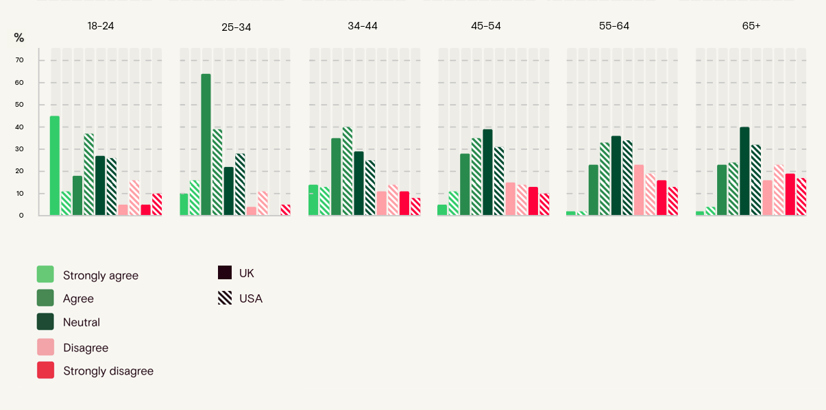 Age shows the clearest divergence, and it differs from earlier findings, in fact agreement peaks among 25 - 34s, especially in the UK (74% agree vs 55% in the US). Among 18 - 24s, the pattern is consistent with UK respondents more likely to agree than US peers (63% vs 48%), with US 18 - 24s more likely to sit in neutral territory (26%). From 45 - 54 onwards, agreement declines and disagreement rises in both markets. Among 65+, agreement drops to 25% UK and 28% US, while disagreement reaches 35% UK and 40% US.